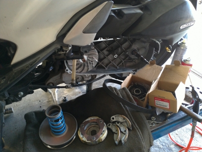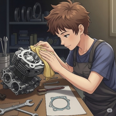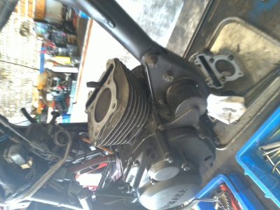 キャブレターやマフラーなどを取り外し、シリンダヘッド、シリンダーを外します。